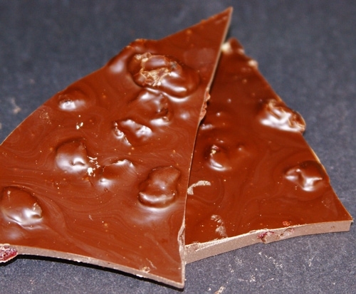 Zutaten: Kuvertüre (Kakaomasse, Zucker, Kakaobutter, Vanille, Emulgator: Sojalecithin), 15% Cranberries; mind. 60% Kakaoanteil