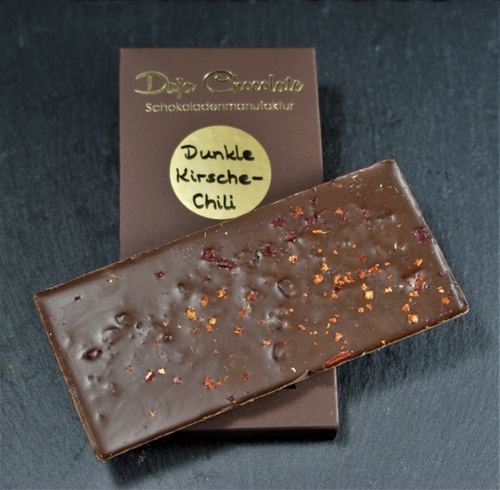 Zutaten: Kuvertüre (Kakaomasse, Zucker, Kakaobutter, Emulgator: Sojalecithin, Vanilleextrakt), Kirsch-Crispy 5% (Glukosesirup, Zucker, Kirschen, Natriumalginat, Chili-Öl 10% (Sonnenblumenöl, Chili), Deko: Chili-Flocken; Kakao: 60% mindestens