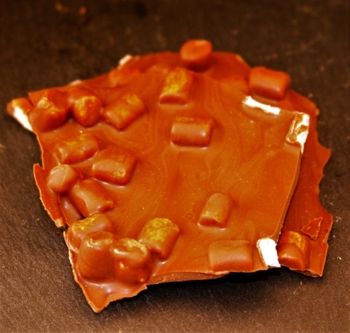 Zutaten: Kuvertüre (Zucker, Kakaobutter, Vollmilchpulver, Kakaomasse, Emulgator: Sojalecithin, Vanilleextrakt), Marshmallows (Glukosesirup, Zucker, Dextrose, Wasser, Stabilisator Sorbit, Gelatine, Aroma), Salz; Kakao: 40% mindestens