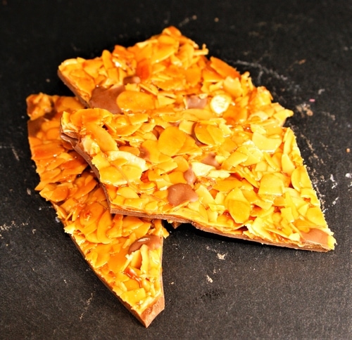 Zutaten: Kuvertüre (Kakaomasse, Vollmilchpulver, Zucker, Kakaobutter, Vanille, Sojalecithin), Florentiner-Masse (Zucker, Mandeln, Butter, Honig, Sahne, Glukosesirup); 40% Kakao mindestens