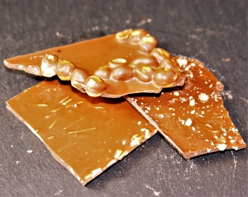 Zutaten: Kuvertüre (Zucker, Kakaobutter, Vollmilchpulver, Kakaomasse, Vanille, Emulgator: Sojalecithin), Haselnüsse, Mandeln, Erdnüsse, Salz; Kakao 40% mind.