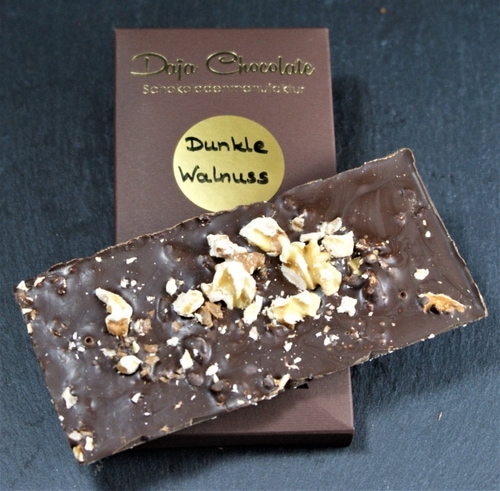 Zutaten: Kuvertüre (Kakaomasse, Zucker, Kakaobutter, Emulgator: Sojalecithin, Vanilleextrakt), Walnüsse 10%, Kakao: 60% mindestens