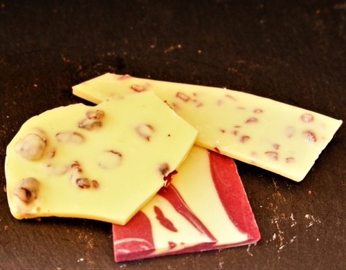 Zutaten: Kuvertüre (Vollmilchpulver, Zucker, Kakaobutter, Vanille, Emulgator: Sojalecithin), Schwarze Johannisbeeren, Cranberries, Himbeeren